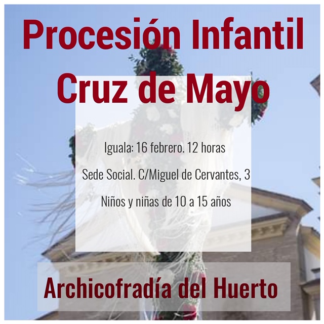 Este año, es de especial interés por parte de la Junta de Gobierno, retomar la procesión infantil de la Cruz de Mayo, que se celebrará el próximo 9 de Mayo. En la cual podrán participar cualquier niño/a con edades comprendidas entre los 10 y 15 años, previa autorización de sus padres o tutores. Adjuntamos fechas y horarios para la preparación de la procesión de la Cruz de Mayo: