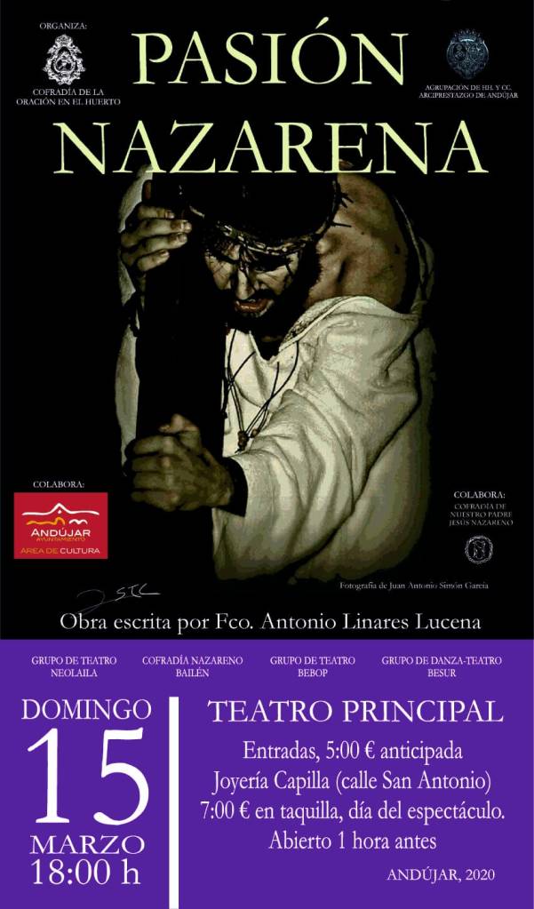Nuestra Hermandad, en colaboración con la Cofradía del Nazareno de Bailen, y con el Ayuntamiento de Andújar, se complace en anunciar la representación de la obra teatral «La Pasión Nazarena». Obra en la cual se plasma la pasión, muerte y resurrección de Nuestro Señor Jesucristo, y de gran éxito en nuestra provincia.